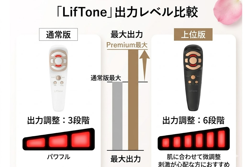 リフトーンの出力レベルは3段階までですが、プレミアムは6段階までと、肌の状態や好みに合わせて細かく調整できます。また、出力レベルの最大値はリフトーンよりもプレミアムのほうが大きいです。