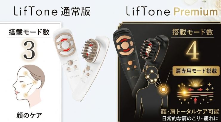 リフトーンは3モードですが、プレミアムは肩専用モードが追加され、4モードあります。そのため、リフトーンプレミアムなら顔のケアだけでなく、肩まわりの筋肉にもアプローチできるため、よりトータルなケアが可能になります。日常的に肩のこりや疲れを感じやすい人にとっては、プレミアムモデルの方が使い道が広がるでしょう。