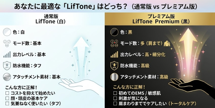 コストを抑えて顔と頭皮の基本ケアを始めたい方や、気兼ねなくお手入れできるタフさを求める方は通常版のLifTone(白)が正解です。一方、初めてEMSを使う方や刺激が気になる敏感肌の方、さらに肩まわりまで1台でトータルケアしたい方はLifTone Premium(黒)を選ぶべきです。