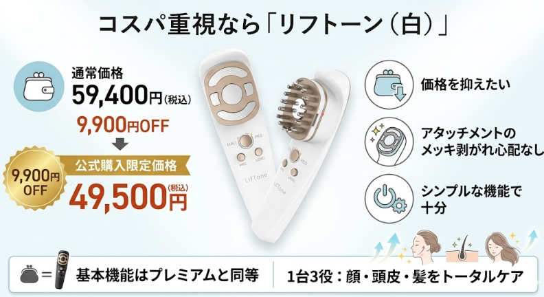 コスパ重視で基本機能を手軽に始めたい方や、お手入れのしやすさを求める方は「リフトーン(白)」を。