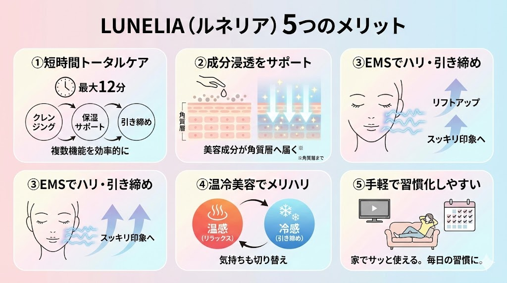 この記事では、話題の多機能美顔器「LUNELIA(ルネリア)」について、リアルな口コミやメリット・デメリットを忖度なしで徹底解説します。