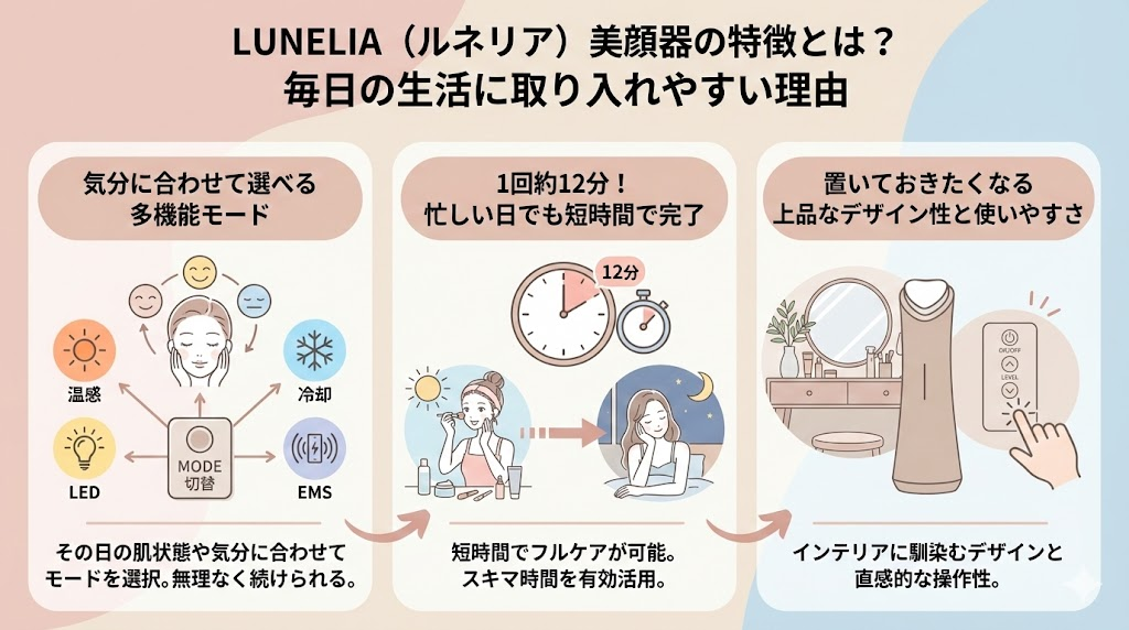 1. LUNELIA(ルネリア)美顔器の特徴とは?毎日の生活に取り入れやすい理由