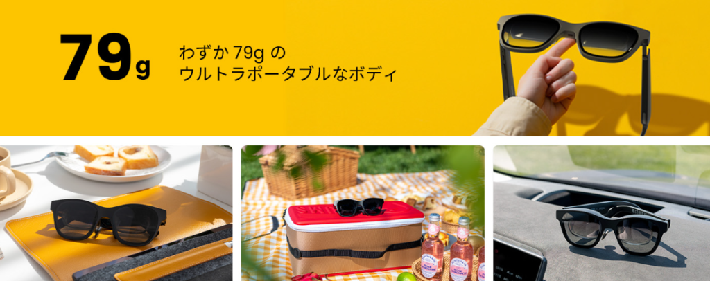 その点、ARグラスであればサングラスと同様の大きさで映像が楽しめるので、あまり違和感なく外でも映像を楽しめます。さらに軽いとなるとVRゴーグルよりは持ち出しやすくて便利です。